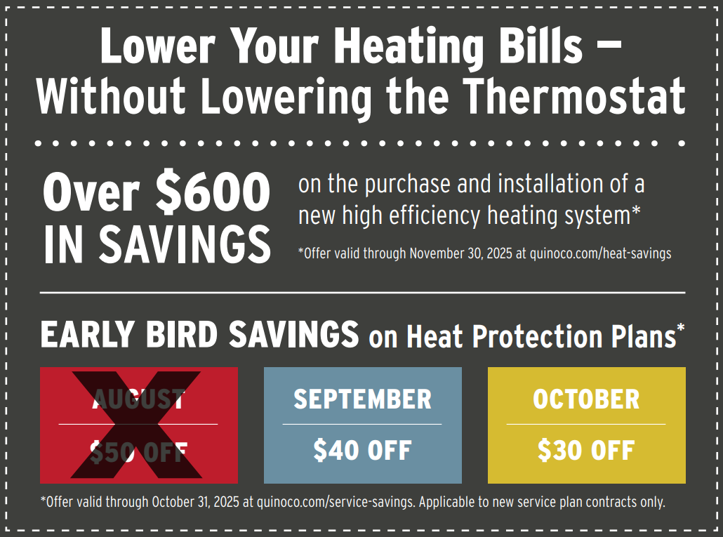 If you’ve been putting off replacing your old furnace or boiler, now is the perfect time to consider an upgrade. No more chilly corners or constantly adjusting the thermostat. And on top of our fall savings on new heating equipment, many models qualify for energy rebates, making the initial investment even more affordable.